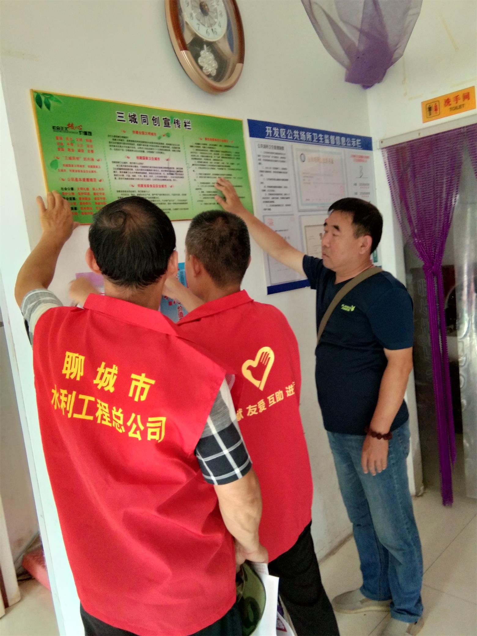 在社區(qū)領(lǐng)導(dǎo)閆書記的帶領(lǐng)下,總公司各支部志愿者手拿宣傳資料,沿街走訪小飯店、理發(fā)店、副食店及暑假培訓(xùn)班等,按各門市性質(zhì),在其室內(nèi)找到合適的地方分別張貼上“社會主義核心價值觀”、“文明用餐”、“文明市民公約”及“三城同創(chuàng)宣傳欄”等宣傳頁及標語。